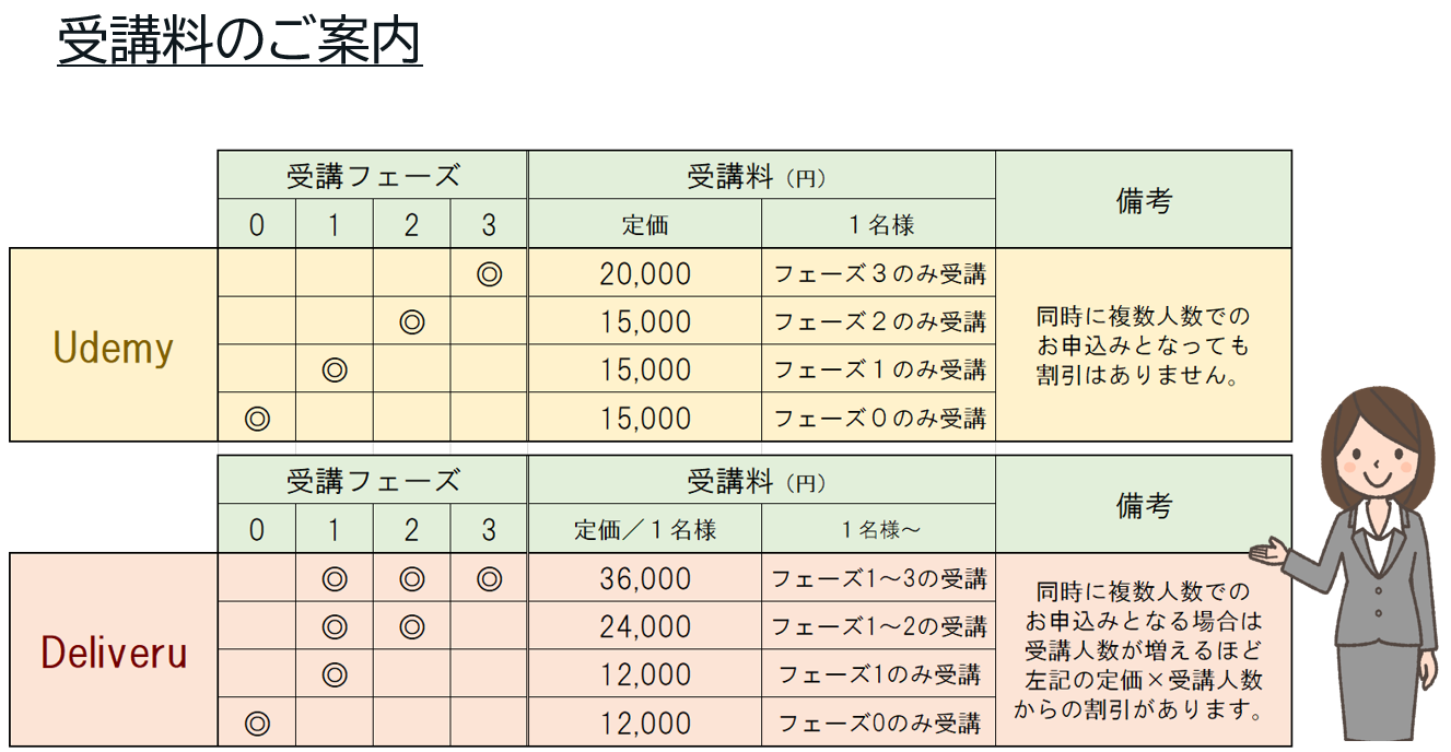 Deliveruサイトの特徴は、法人企業様が想定する研修プランにも、柔軟にご対応できるという点です。Udemyサイト利用時と比較すれば、受講講座の合計数が多くなるほどに受講単価は下がります。よって、複数人数でのグループ学習に適しています。